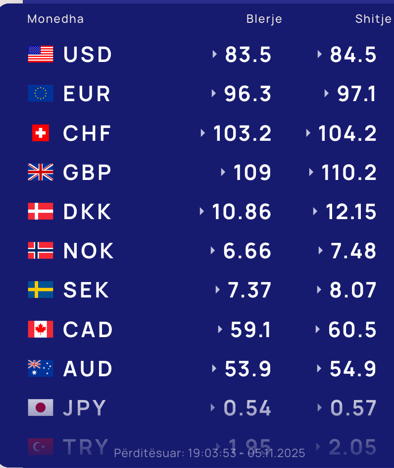 Për kursin e monedhave të tjera shihni tabelën e mëposhtme: