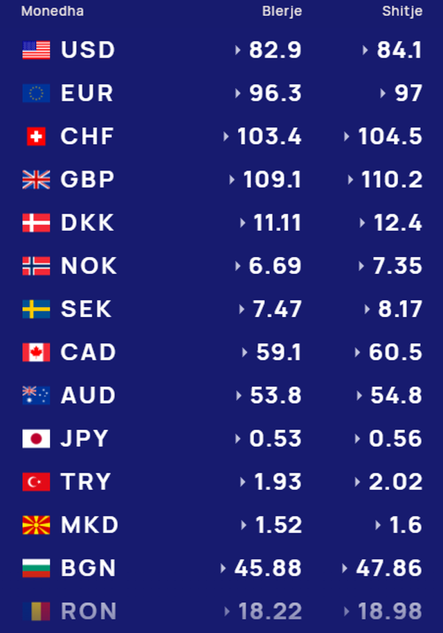 Për kursin e monedhave të tjera shihni tabelën e mëposhtme: