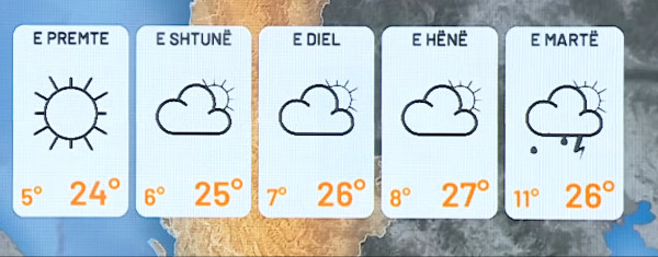 Fundjava do të jetë kryesisht me diell dhe me rritje graduale të temperaturave, që pritet të arrijnë deri në 26°C në disa zona. Megjithatë, pas ditës së hënë parashikohet shtim i vranësirave dhe rikthim i reshjeve ditën e martë.