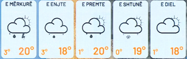 Pesëditëshi sjell mot të paqëndrueshëm: e marta me reshje të pakta, e mërkura dhe e enjtja me intensifikim shiu, e premtja me një pauzë të lehtë, dhe e shtuna me reshje të pakta e dëborë në verilindje, për t’u kthjelluar të dielën.