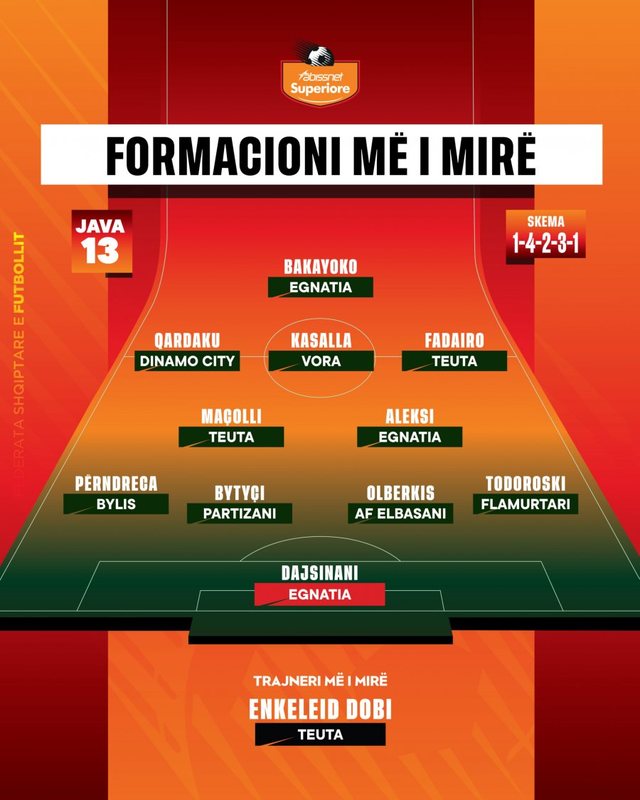 Pas përfundimit të javës së 13-të në Kampionatin Kombëtar, trajnerët kanë përzgjedhur formacionin ideal sipas skemës 4-2-3-1, ku spikat prania e lojtarëve të Egnatias dhe Teutës. Në portë është vendosur Mario Dajsinani, ndërsa linja e mbrojtjes përbëhet nga Përndreca, Bytyçi, Olberkis dhe Todoroski. Dyshja mbrojtëse e mesfushës formohet nga Macolli dhe Aleksi, duke siguruar balancën para treshes ofensive Qardaku–Kasalla–Fadario, të cilët mbështesin sulmuesin kryesor Soumaila Bakayoko.