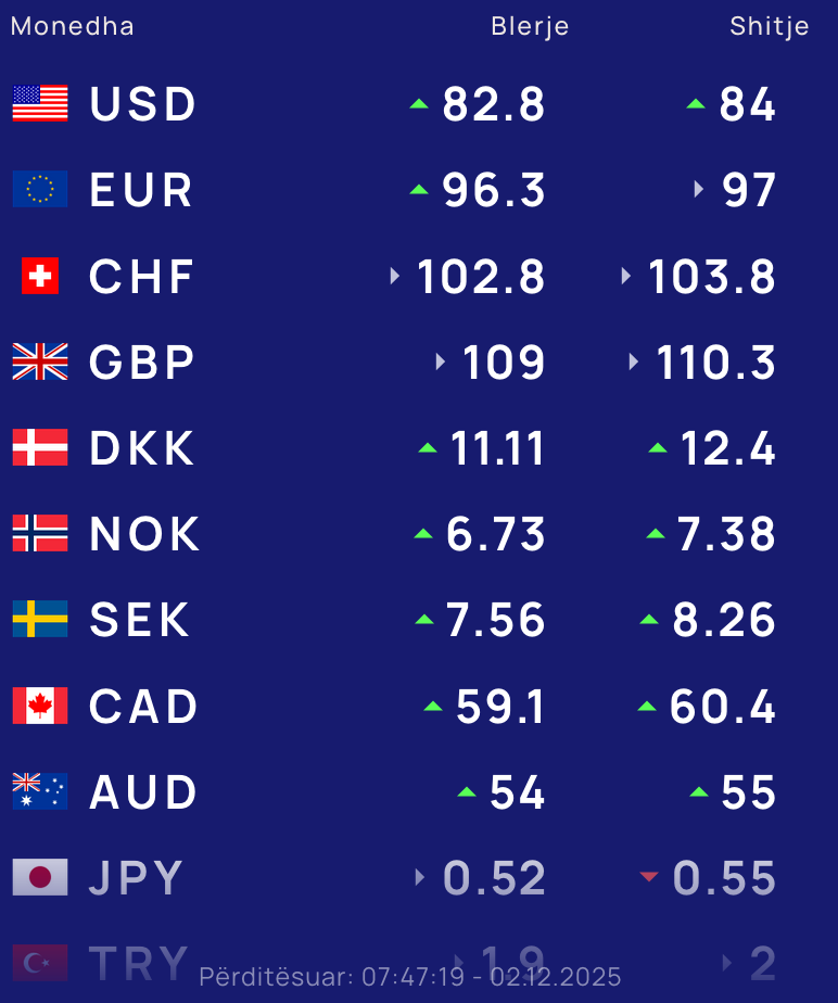 Për kursin e monedhave të tjera shihni tabelën e mëposhtme: