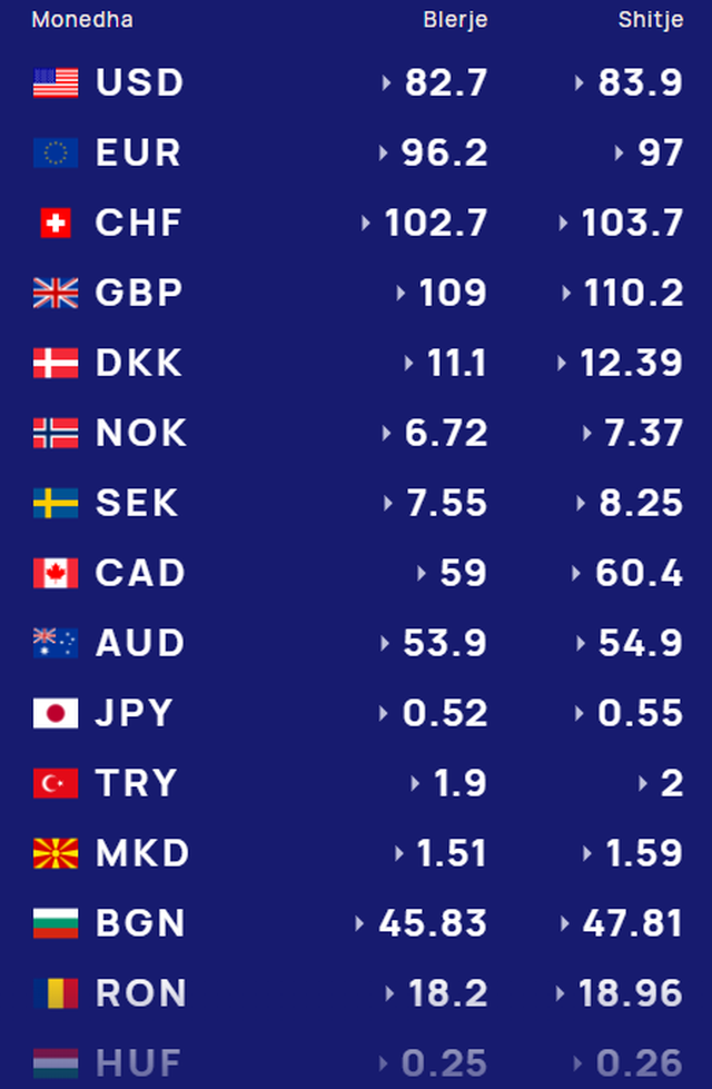 Për kursin e monedhave të tjera shihni tabelën e mëposhtme: