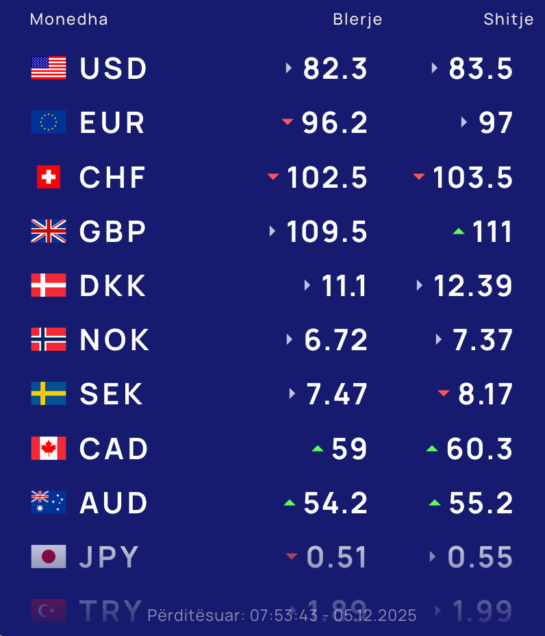 Për kursin e monedhave të tjera shihni tabelën e mëposhtme: