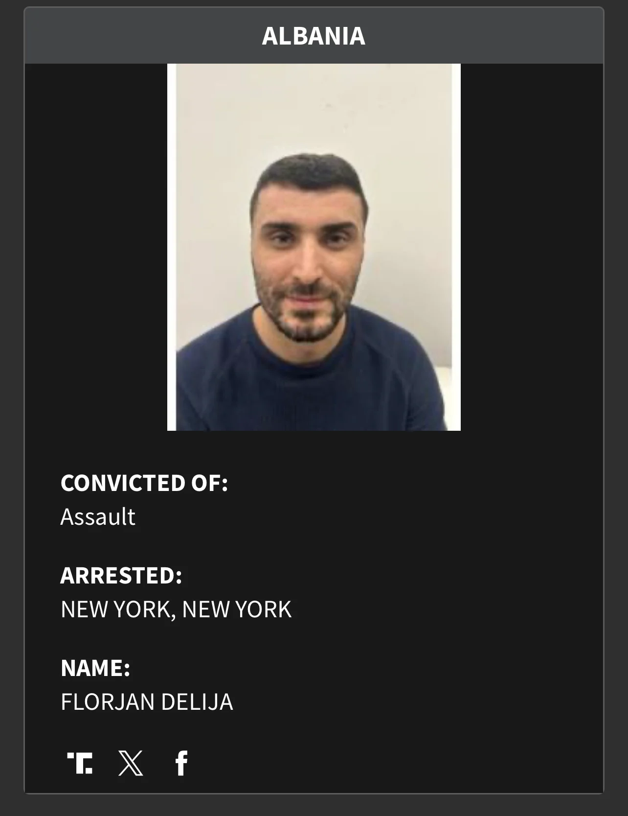Florjan Delija – i dënuar për sulm, arrestuar në Nju Jork.