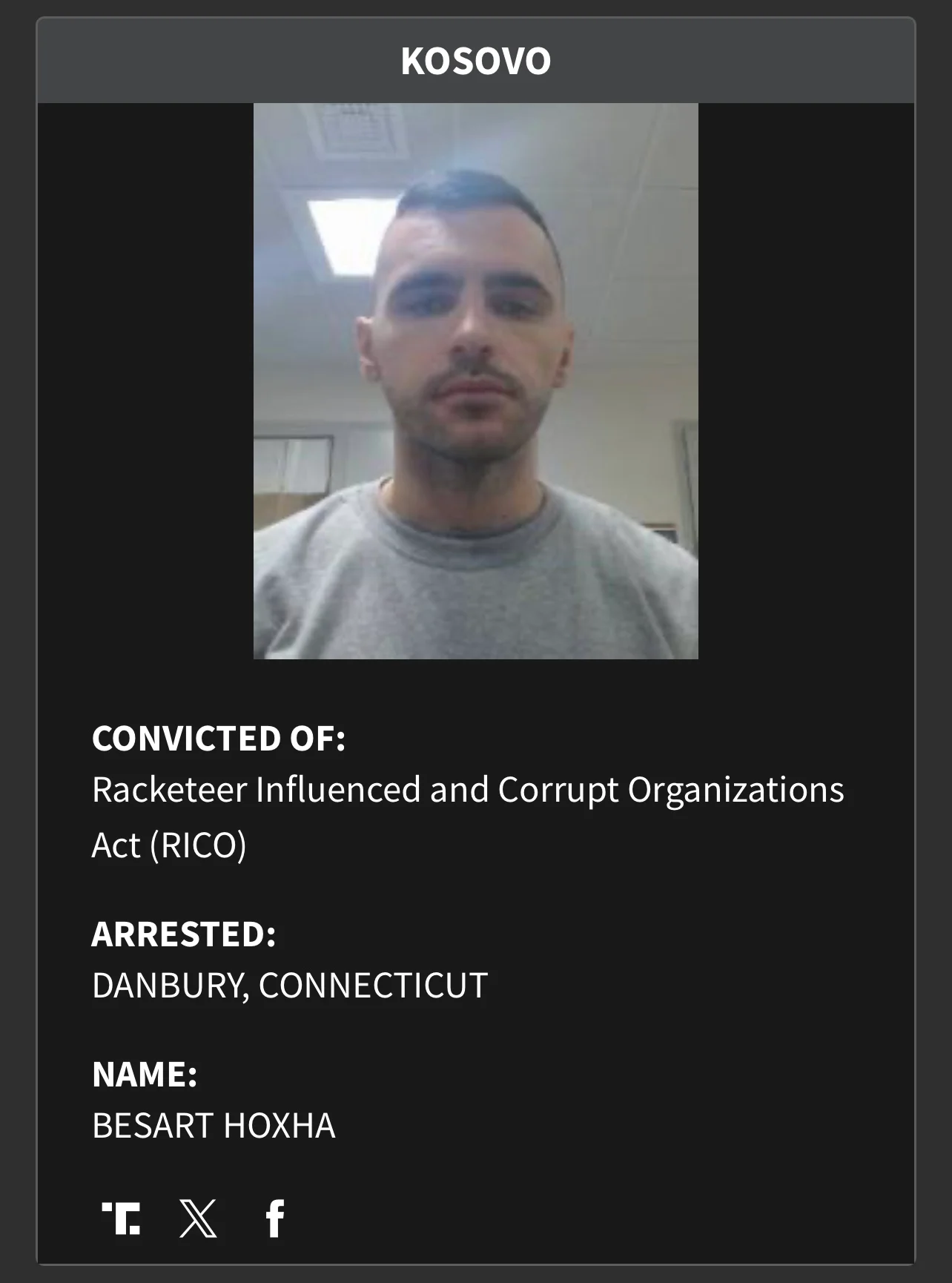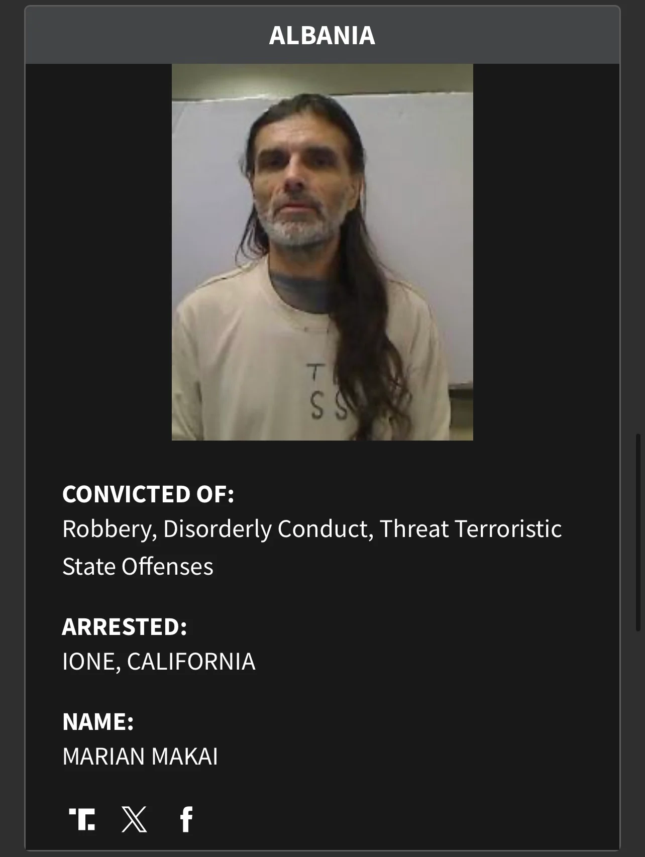 Marian Makai – i dënuar për vjedhje, sjellje të çrregullt dhe kërcënime terroriste, i arrestuar në Kaliforni.