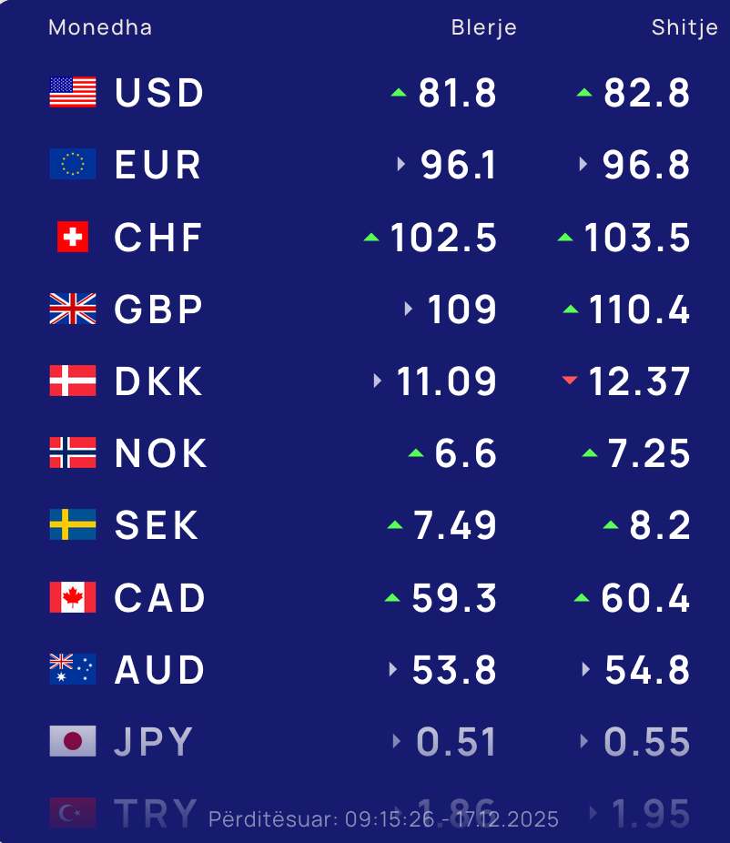 Për kursin e monedhave të tjera shihni tabelën e mëposhtme: