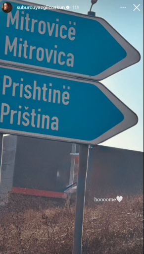 Në postimin e parë të postuar në “Instastory”, aktorja e famshme ka ndarë me 6.4 milionë ndjekësit e saj një foto ku shfaqet një tabelë rrugore dhe në të shkruhet ‘Mitrovicë, Prishtinë’.